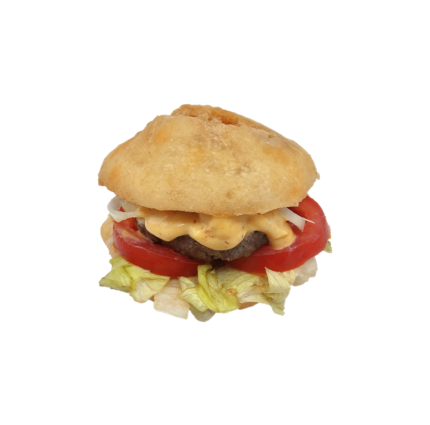 A Johnny Cake with a juicy hamburger patty nestled inside, a perfect fusion of classic comfort foods.